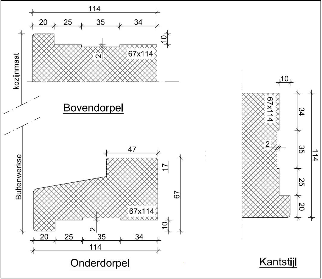 Zowel het Mahonie, Finti en Accoya kozijnprofiel hebben een kozijnafmeting van 67 x 114 mm waarbij tussenstijlen en dorpels 90 x 114 mm zijn. Voor onze houten schuifpuien gebruiken zwaarder kozijnhout met een afmeting van 67 x 138 mm.