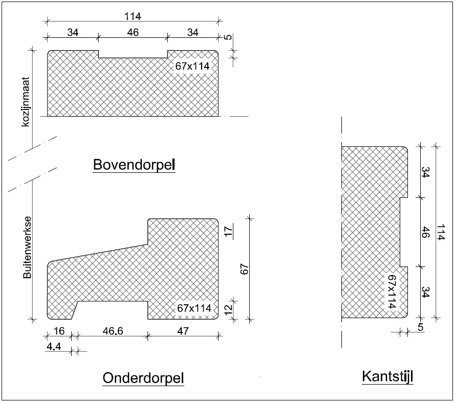 We bieden bij de houten deurkozijnen ook de mogelijkheid voor een houten onderdorpel. Wanneer het kozijn op het peil wordt geplaatst adviseren wij een kunststof of aluminium onderdorpel.