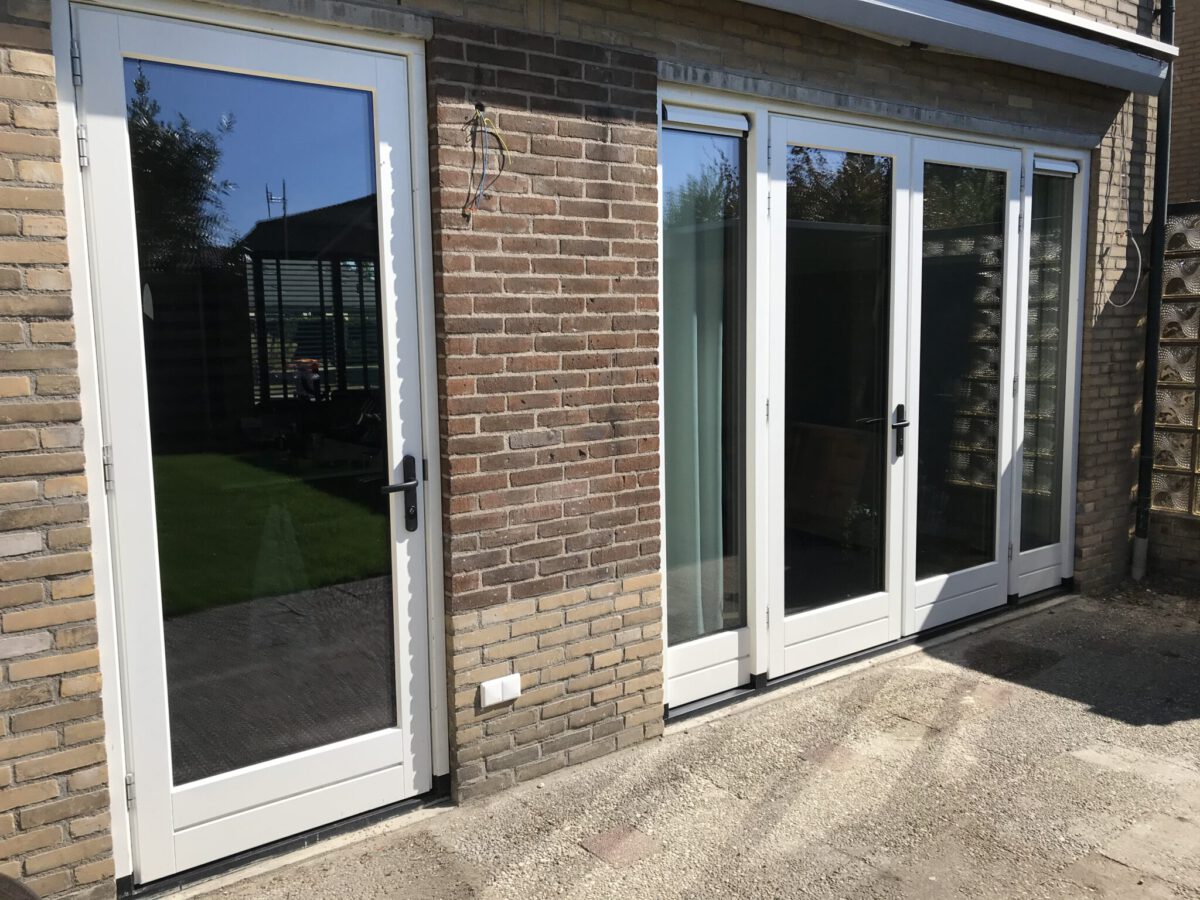 Een borstwering van 2 stapeldorpels (249 mm hoog) of 3 stapeldorpels (359 mm) zou hiervoor erg geschikt zijn. Hieronder zie je een voorbeeld van een achterdeur en tuindeuren waarbij gekozen is voor 2 stapeldorpels.