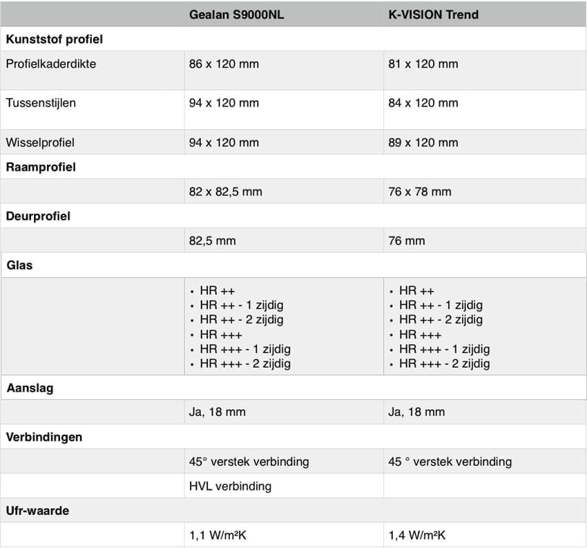 Beide profielen hebben een verdiept systeem, dit betekent dat het raam verdiept in het kozijn ligt. Het K-VISION Trend profiel heeft twee dichtingen, waar het Gealan profiel drie dichtingen heeft. Deze derde middendichting is uniek in het kozijnprofiel. Het voordeel van de derde dichting is dat er een isolatiewaarde van 1,1 Ufr kan worden behaald. Om inzichtelijk te maken wat nou daadwerkelijk het verschil is, hebben we in onderstaande tabel de eigenschappen van het kozijn uitgelicht.
