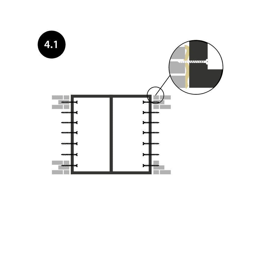 Zorg dat de DTS dorpel om de 150 mm verankerd wordt aan de constructie of met een spouwlat om krimpen en uitzetten van de dorpel bij temperatuurverschillen te voorkomen. Ondersteun de onderdorpel van het kozijn op meerdere plekken, maar in ieder geval onder de stijlen, dit zijn de belangrijkste punten.