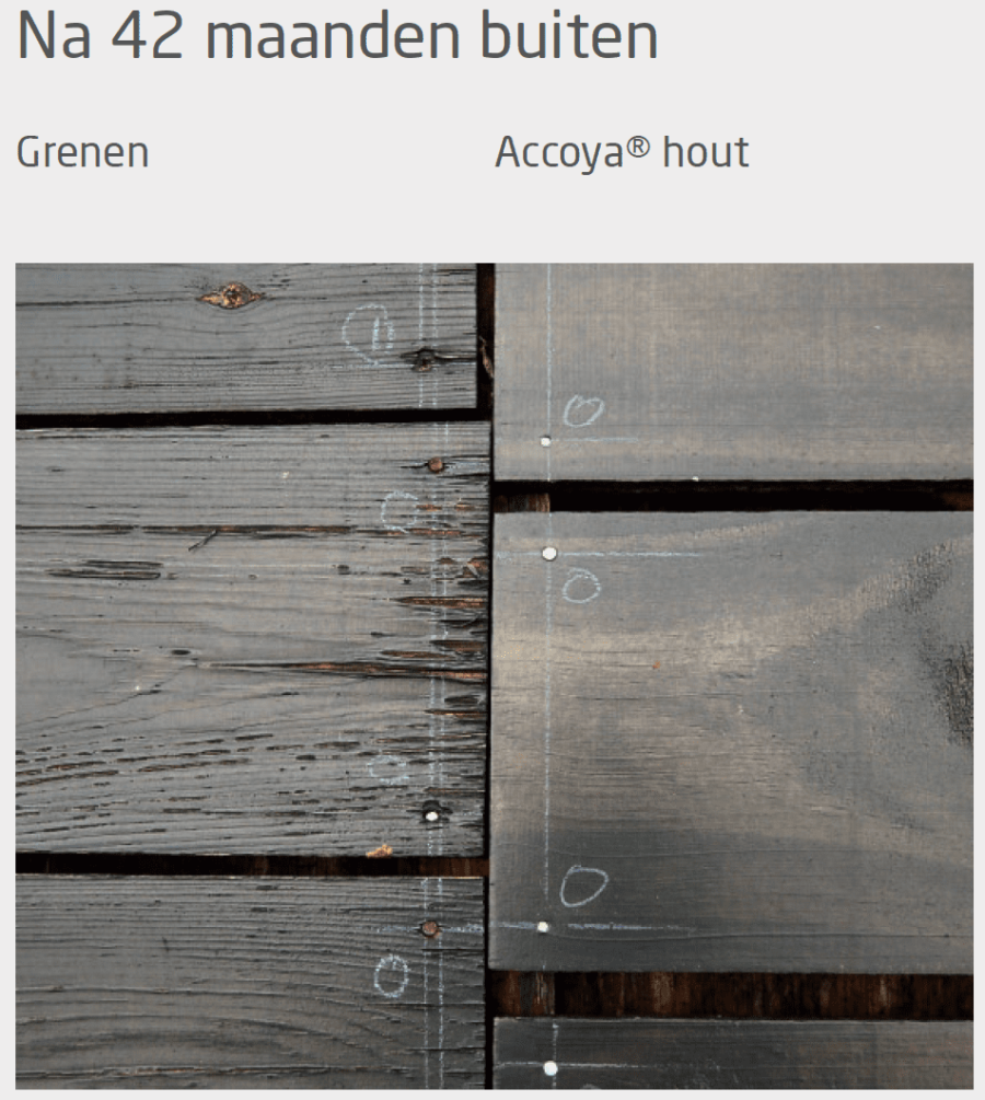 Accoya hout kan aantoonbaar de zwaarste buitenomstandigheden aan: de houtsoort is gedurende lange perioden onder alle blootstellingsomstandigheden getest, zowel bovengronds, ondergronds en in water. Doordat de houtsoort nauwelijks krimpt of uitzet, is er een verminderd risico op klemmen bij vochtige omstandigheden en is er sprake van beter sluitende ramen en deuren onder alle weersomstandigheden. Accoya vermindert minimaal 75% van het krimp- en zwelgedrag.