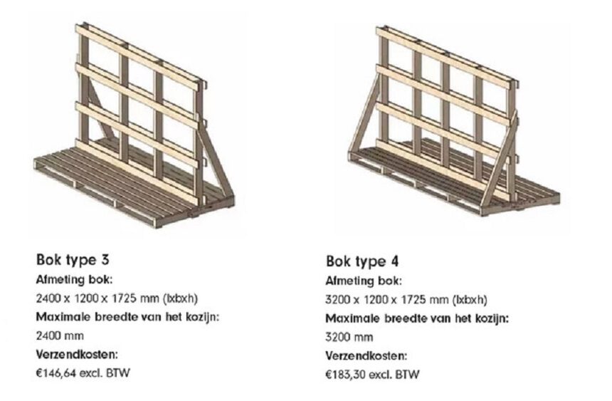 Let op! De houten bokken zijn uitsluitend voor transport van kozijnen, er kan niet gehesen worden met de bok. Daar zijn de bokken niet voor gemaakt en niet op getest.
