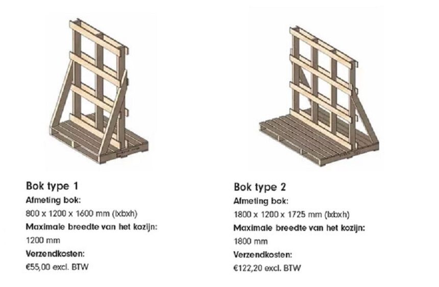 Om de transportkosten nauwkeuriger te kunnen berekenen, werken we met 4 typen houten bokken in verschillende afmetingen. Bij een bestelling wordt automatisch berekend welke bok het meest geschikt is op basis van het aantal kozijnen en de afmetingen. Elk boktype heeft een vaste verzendprijs. Je betaalt op deze manier nooit teveel voor de verzending van jouw kozijn(en).