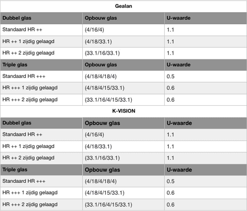 Naast dubbel glas leveren wij tegenwoordig ook triple beglazing voor zowel onze kunststof kozijnen als de houten kozijnen. Waarom zou je voor triple glas gaan in plaats van dubbel glas? De derde glaslaag van triple glas zorgt voor extra isolatie en een lagere U-waarde. Hoe lager, hoe beter! De dikte van de glaslagen verschillen, zie onderstaande tabel. Let op: de opbouw is altijd genoteerd van buiten naar binnen. Lees hier meer over de opbouw van het glas.