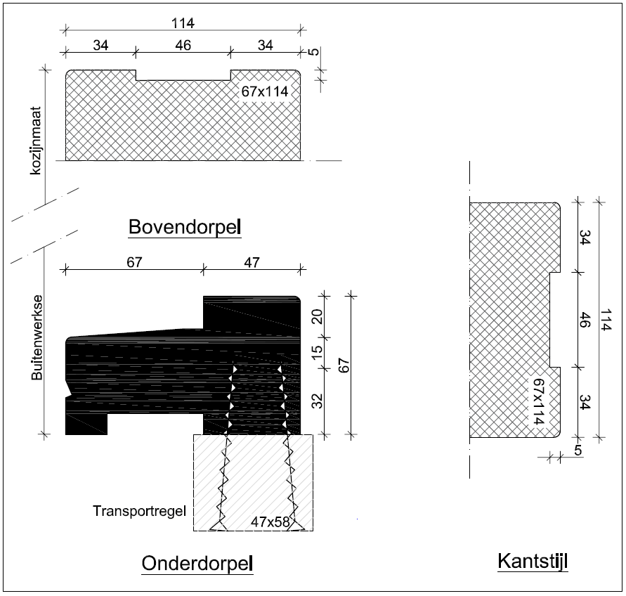 Zowel het Mahonie, Finti en Accoya kozijnprofiel hebben een kozijnafmeting van 67 x 114 mm waarbij tussenstijlen en dorpels 90 x 114 mm zijn. Voor onze houten schuifpuien gebruiken zwaarder kozijnhout met een afmeting van 67 x 138 mm.