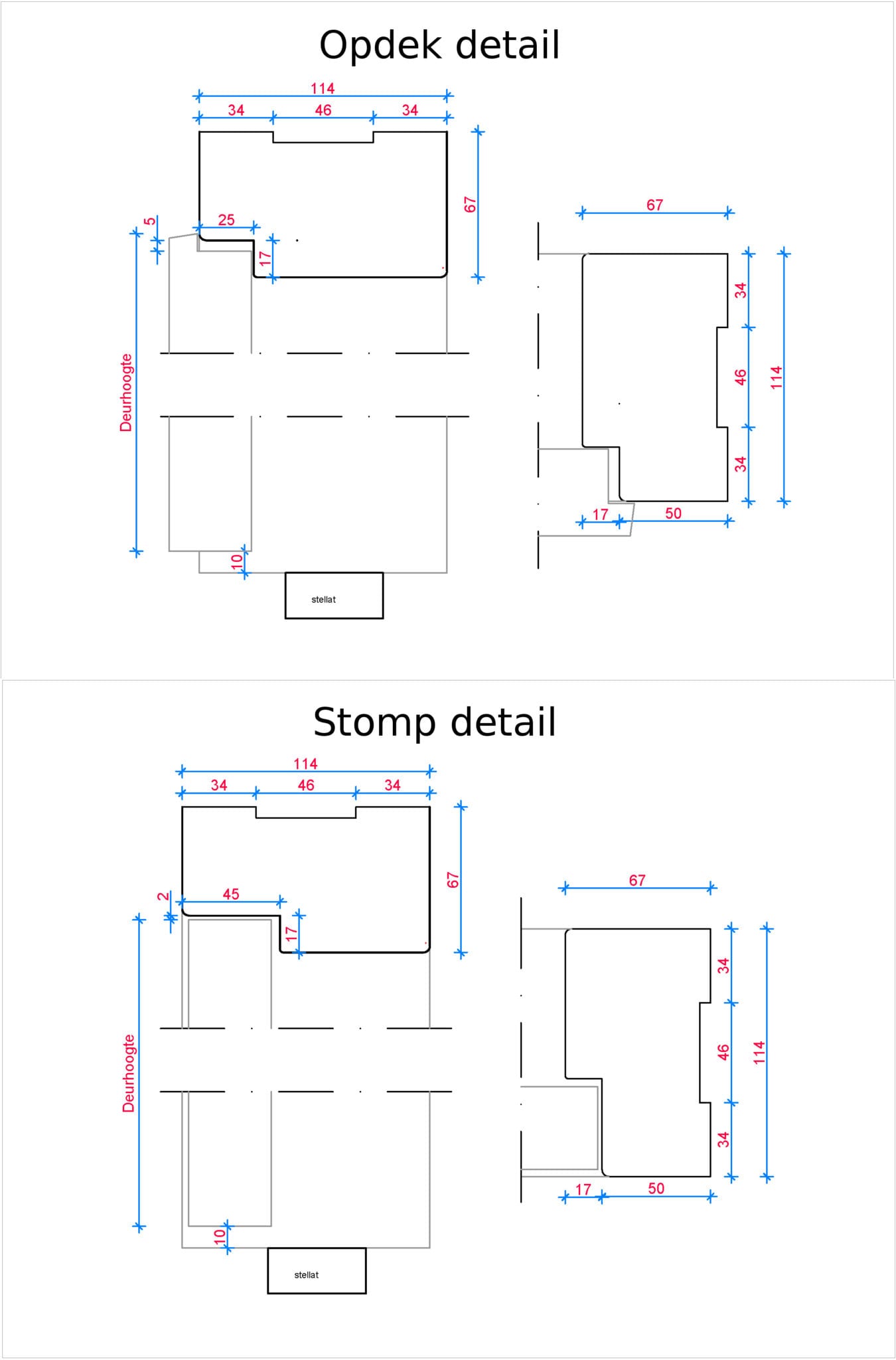 De deursponning voor een stompe deur is 17 x 45 mm en voor een opdekdeur is de deursponning 17 x 25 mm.