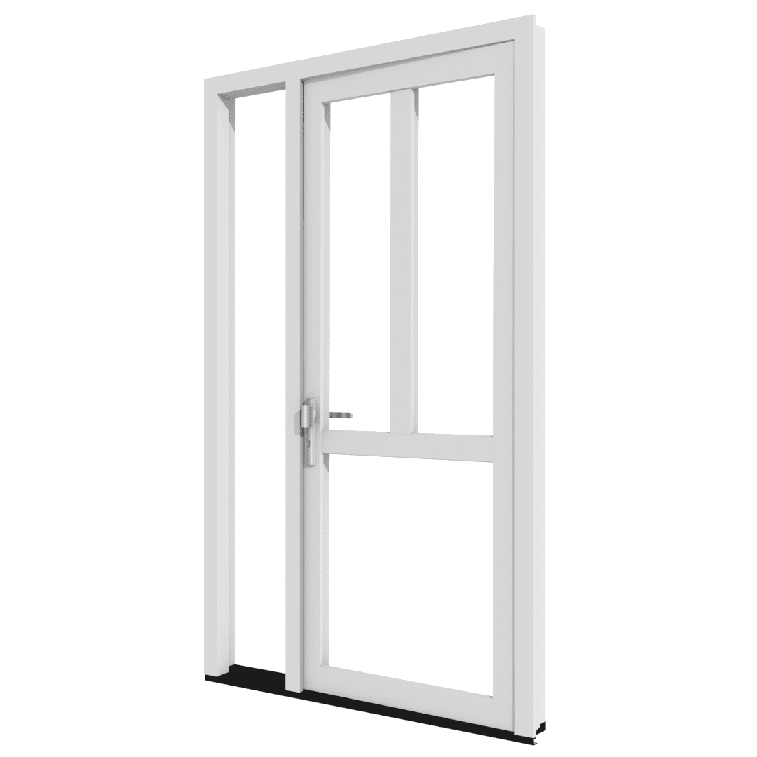 Dit is het kunststof kozijn met voordeur genaamd TK04. Aan de linkerkant van de deur is een zijlicht toegepast. Door middel van een tussendorpel is het deur in twee vakken verdeeld. In het onderste vak is volledig van glas. Het bovenste vak is verdeeld in twee vakken door middel van een tussenstijl. In deze vakken wordt ook glas geplaatst. Het kozijn kan geleverd worden met dubbel glas (HR++) of triple glas (HR+++) voor hoge isolatiewaarden. De voordeur is voorzien van een meerpuntssluiting, voordeurgarnituur een cilinder en zelfs kerntrekbeveiliging. Door de toepassing van de laagrelief dorpel heb je een lage opstap. Je hebt de keuze voor een verdiept of een vlak profiel, beide profielen zijn altijd voorzien van een aanslag. De kleur en afwerking kun je geheel naar eigen wens bepalen. Kies voor een houtnerfstructuur doormiddel van renolit folie, kies voor Acryl colour of laat het kozijnprofiel juist glad wit of glad crème. De kunststof kozijnen en ramen worden samengesteld uit gerenommeerde profielsystemen. Zoals onder andere Gealan en K-VISION. Je kunt de maatvoering van het kozijn en de maatvoering van de vakken hierboven eenvoudig aanpassen en eventueel extra opties toevoegen.